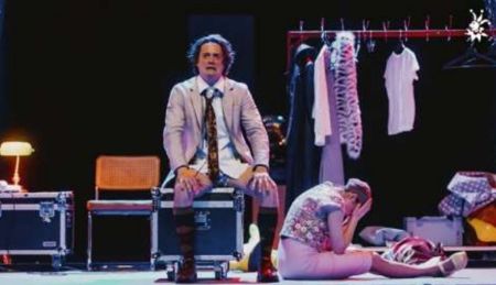 Domen Valič in Saša Pavlin Stošić v dveh izmed sedmih likov v predstavi (FOTO: Marko Ocepek)